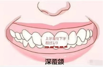 深覆合,是一种上下颌牙弓的垂直关系的异常。指的是上前牙切缘盖过下前牙牙冠长度1/3者或下前牙咬合于上前牙舌侧1/3以上。